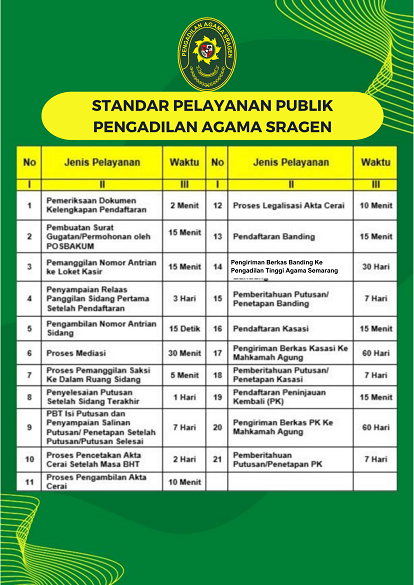 Standar Pelayanan Pengadilan memiliki muatan standar pelayanan publik yang selaras dengan Pasal 21 Undang-Undang No.25 Tahun 2009. Pasal tersebut mengamanatkan harus ada 14 poin yang terdapat dalam setiap standar pelayanan publik, yaitu diantaranya sistem, mekanisme dan prosedur; jangka waktu penyelesaian; biaya/tarif; fasilitas; evaluasi kinerja pelaksana.