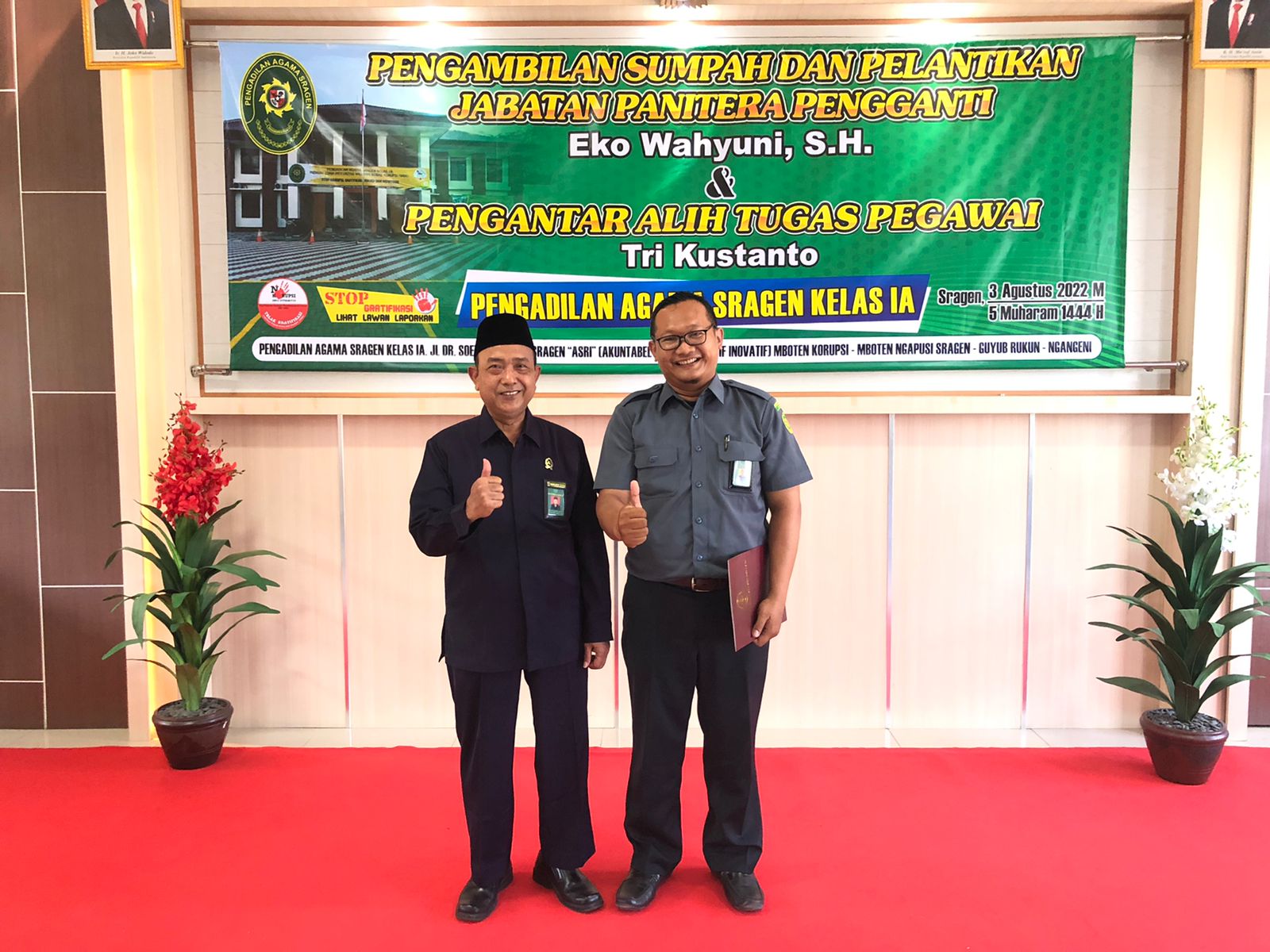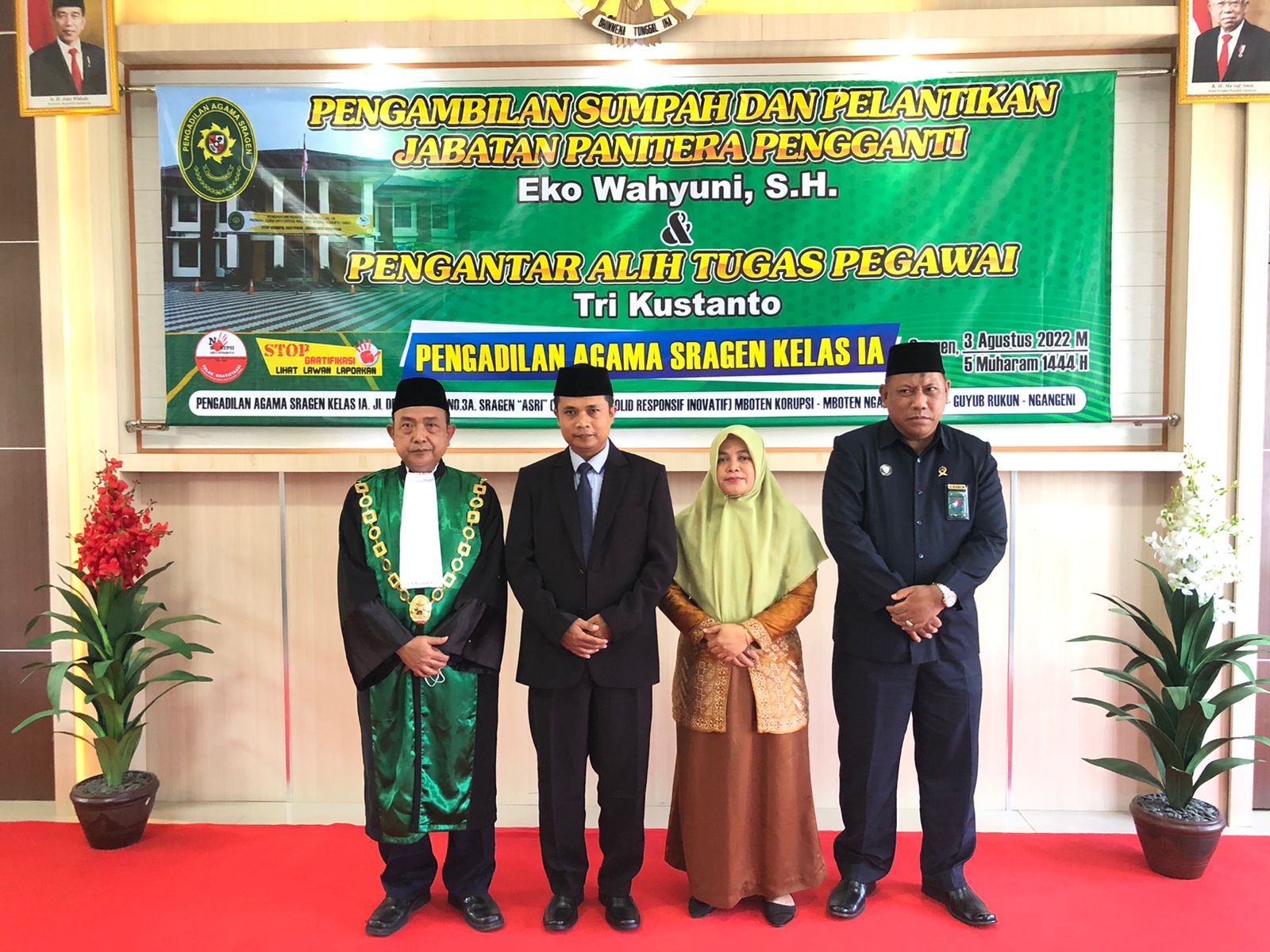 Bertempat di ruang Media Center Pengadilan Agama Sragen, Rabu, 03 Agustus 2022, Ketua Pengadilan Agama Sragen, Drs. Lanjarto, MH., melantik Panitera Pengganti Pengadilan Agama Sragen, Eko Wahyuni, SH. Yang sebelumnya sebagai Panitera Pengganti Pengadilan Agama Ngawi Kelas 1B. Acara berlangsung khitmad dengan mengedepankan phisical distancing serta memperhatikan protokol ksehatan yang ketat, acara di mulai pada pukul 13.30. WIB.