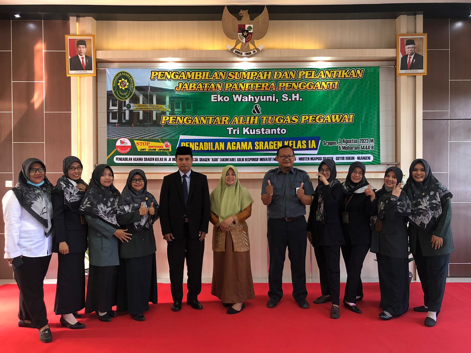 Acara Pelantikan oleh Ketua Pengadilan Agama Sragen, Drs. Lanjarto, MH yang kemudian dilanjutkan dengan Pengambilan Sumpah Eko Wahyuni, SH. menjadi Panitera Pengganti Pengadilan Agama Sragen. Dalam acara Pengambilan sumpah tersebut menjadi saksi adalah Drs. Amir, Nisfatul Laili, S.Sy, dan Dr.M. Nur Hasan Latief, S.H.I., S.H., M.M. Setelah acara pengambilan Sumpah selesai, dilanjutkan dengan perkenalan dari Panitera Pengganti Pengadilan Agama Sragen, Eko Wahyuni SH., MH.