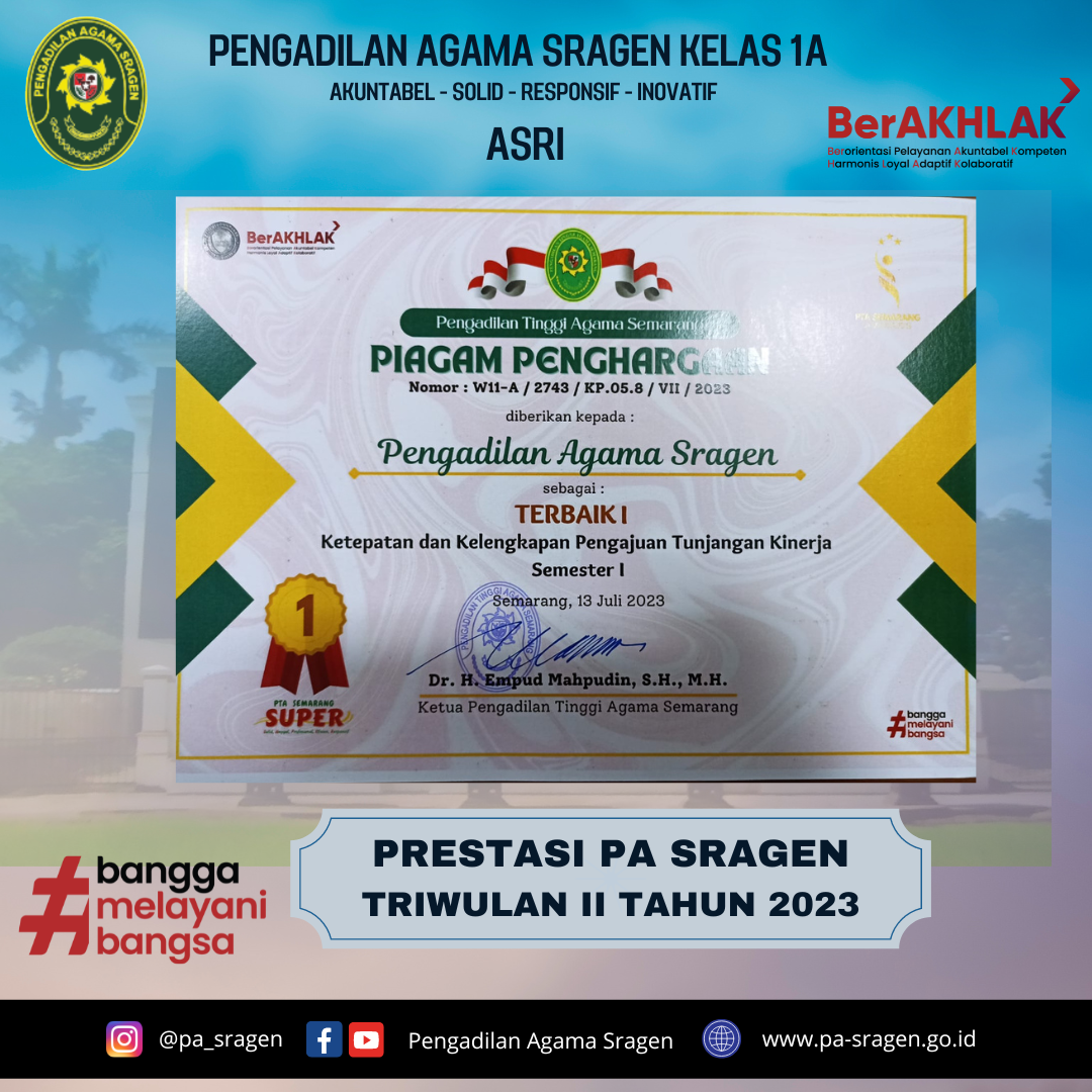Pengadilan Agama Sragen meraih 3 Penghargaan dalam Penilaian Kinerja Triwulan II Tahun 2023 dalam bidang Kesekretariatan dan Kepaniteraan Pengadilan Agama se-Jawa Tengah. Adapun Penghargaan yang di raih Pengadilan Agama Sragen, yaitu :