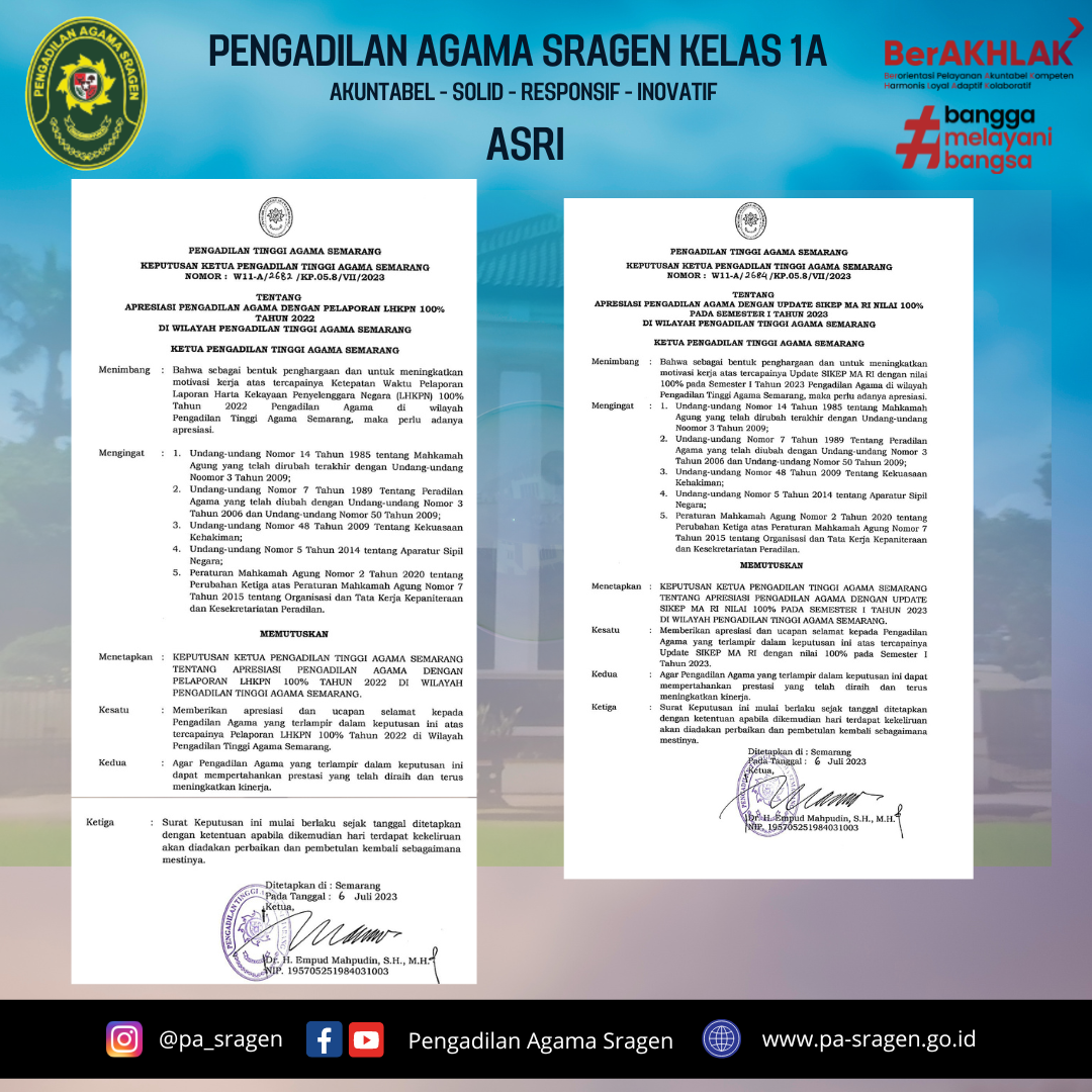Kamis, 13 Juli 2023 Unsur pimpinan Pengadilan Agama Sragen menghadiri acara pembinaan dan rapat koordinasi percepatan penyelesaian perkara serta penyerahan piagam penghargaan triwulan II Pengadilan Agama se-Wilayah Pengadilan Tinggi Agama Semarang Tahun 2023 di The Sunan Hotel Solo. Peserta acara terdiri dari Ketua Pengadilan, Wakil Ketua Pengadilan, Panitera, dan Sekretaris se- Wilayah Pengadilan Tinggi Agama Semarang. Pada acara tersebut diumumkan penghargaan untuk beberapa kategori prestasi Pengadilan Agama se Jawa tengah. Berdasarkan Surat Ketua Pengadilan Tinggi Agama Semarang Nomor W11-A/2681/HM.01.1/VII/2023 tanggal 06 Juli 2023 perihal Tim Penilai Kinerja Triwulan II Bidang Kesekretariatan dan Kepaniteraan Pengadilan Agama se- Jawa Tengah.