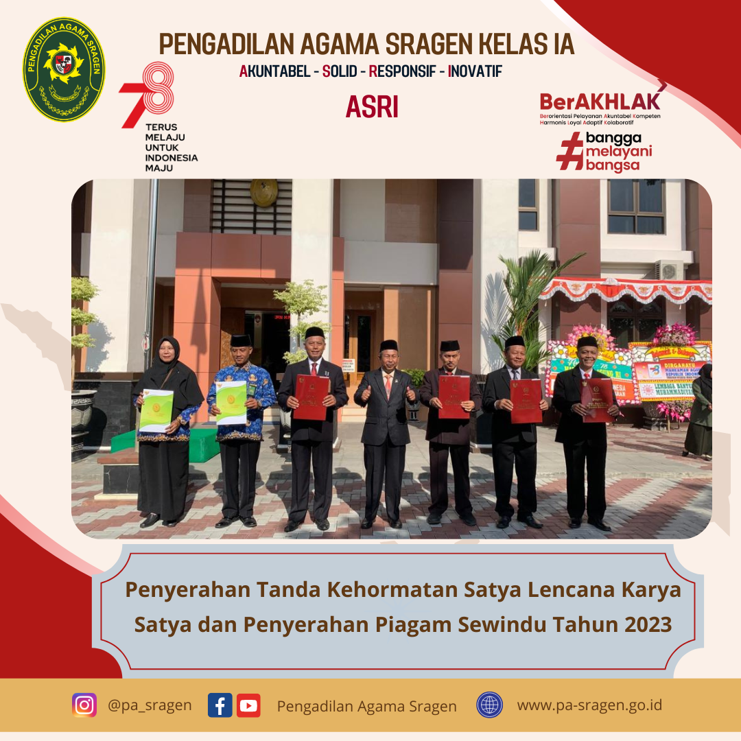 Pada Acara Memperingati 17 Agustus 1945 yang ke 78 Tahum, Wakil Ketua PA Sragen Drs.Juaini,S.H. memberikan Penyematan Tanda Kehormatan Satya Lencana Karya Satya XX dan XXX tahun dan Penyerahan Piagam Karya Sewindu dan Dwi Windu Tahun 2023. Berikut kami lampirkan daftar nama penerima penghargaan Tanda Kehormatan Satya Lencana Karya XXX tahun dan Penyerahan PIAGAM Karya Sewindu dan Dwi Windu Tahun 2023