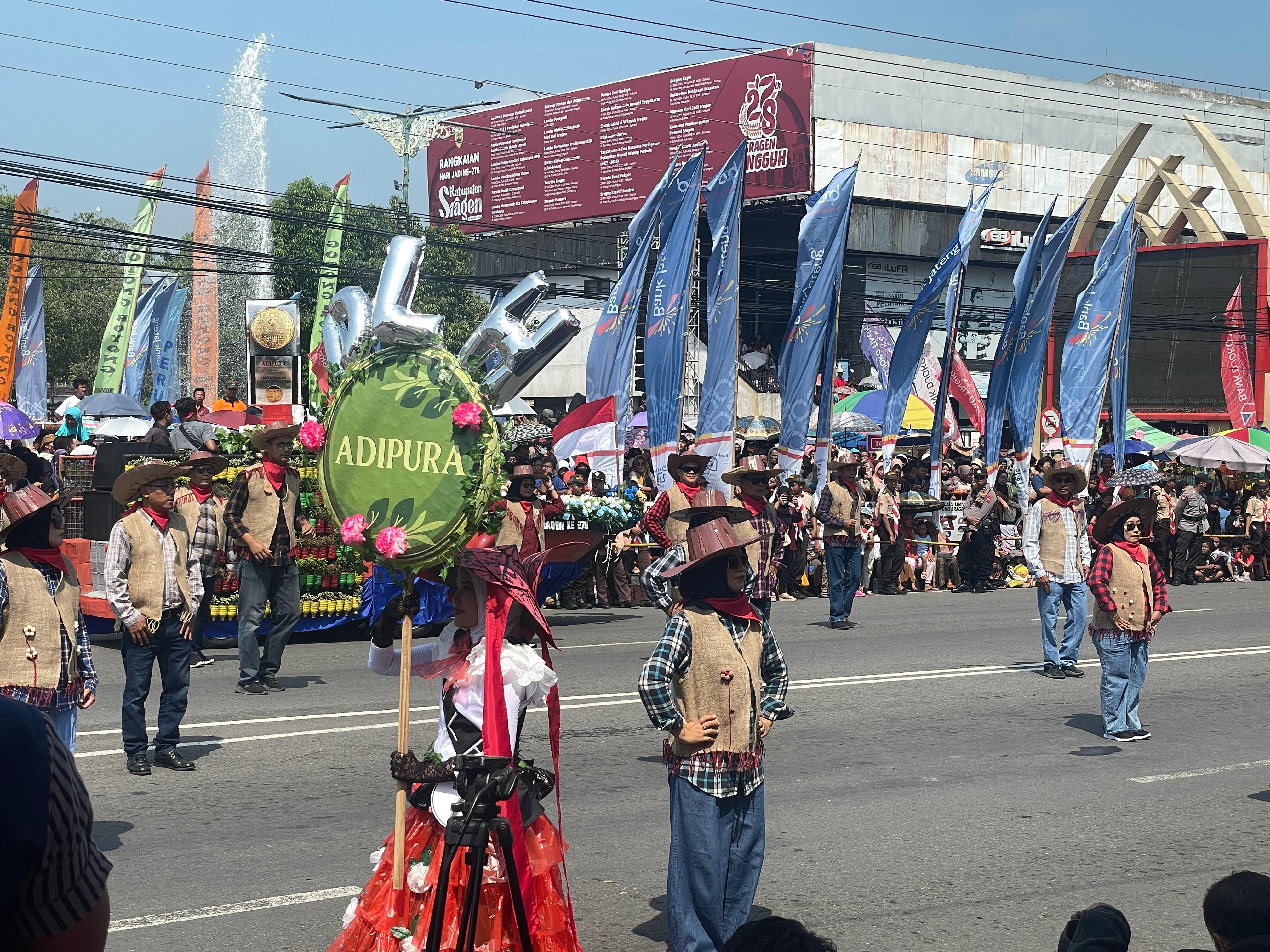 Karnaval dimulai dari pasukan paskibraka dan drumband dari Yonif Raider 408/Suhbrastha. Setelah itu dilanjut “DLH menampilkan koboi yang mengolah barang bekas yang bisa dimanfaatkan kembali. Seperti botol bekas jadi vertikal garden, kardus bekas jadi topi, goni jadi rompi, kapal dibuat dari kardus mi instan. Temanya dengan semangat koboi mempertahankan Adipura,” jelas Kepala DLH Sragen Rina Wijaya